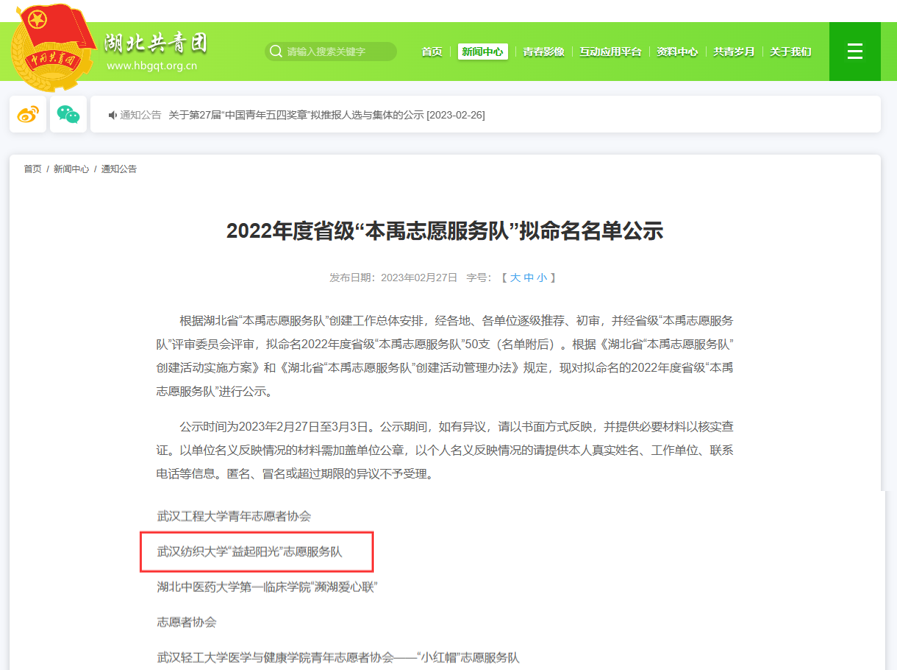 yl23455永利官网“益起阳光”志愿服务队入选2022年度湖北省“本禹志愿服务队”