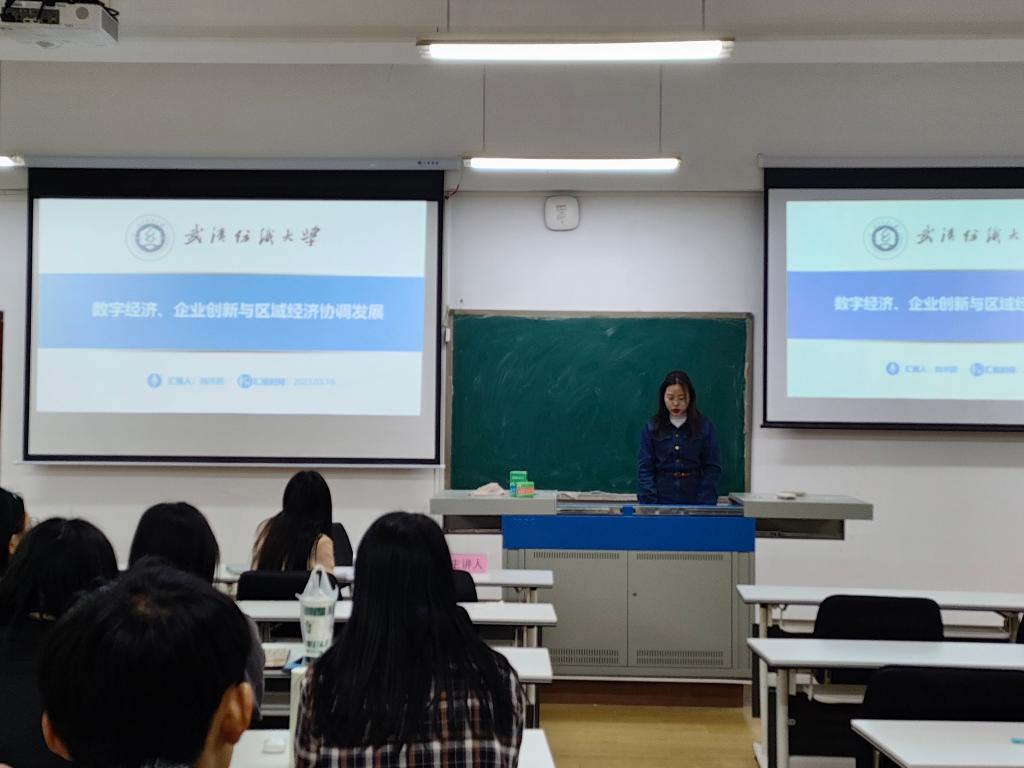 此次论坛中,魏琳鹏同学分享的论文题目是《数字经济、企业创新与区域经济协调发展》,从研究背景、文献综述、理论分析与研究、研究设计与数据说明及研究结论等方面对该论文进行分析讲解。漆老师对论文题目、信息更新、理论分析等方面提出建议。