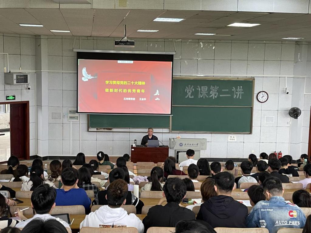 王金华带来的报告主题是《学习贯彻党的二十大精神、争做新时代的优秀青年》。他围绕“党的二十大主题和主要成果”“党的二十大报告主要内容”“学习贯彻二十大精神,做新时代的优秀青年”三个方面展开宣讲。他结合具体数据和自己的体会,带领大家一起回顾党过去五年的重大成就和新时代十年来的伟大变革,深入浅出地讲述党的二十大报告主要内容与精神内涵。
