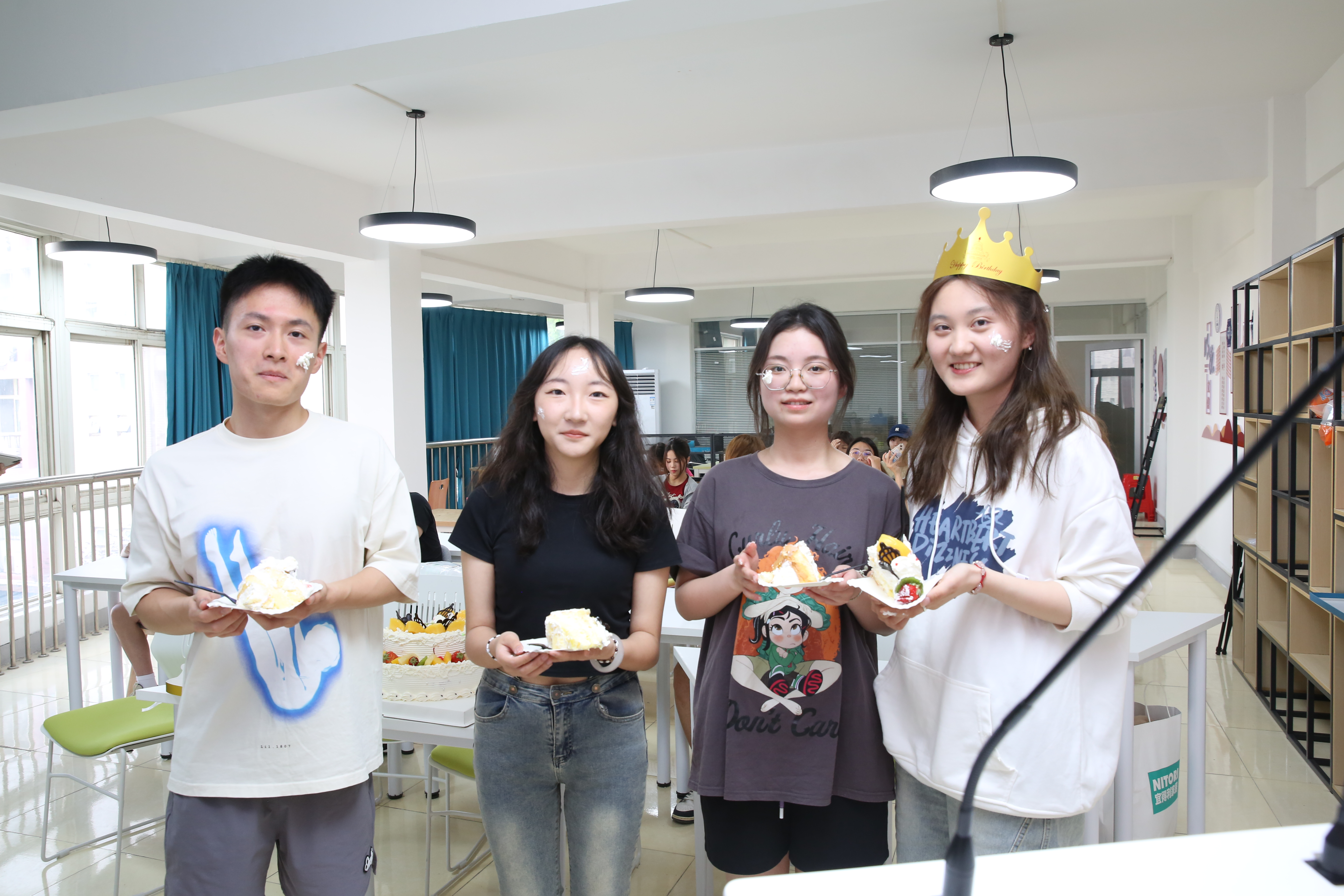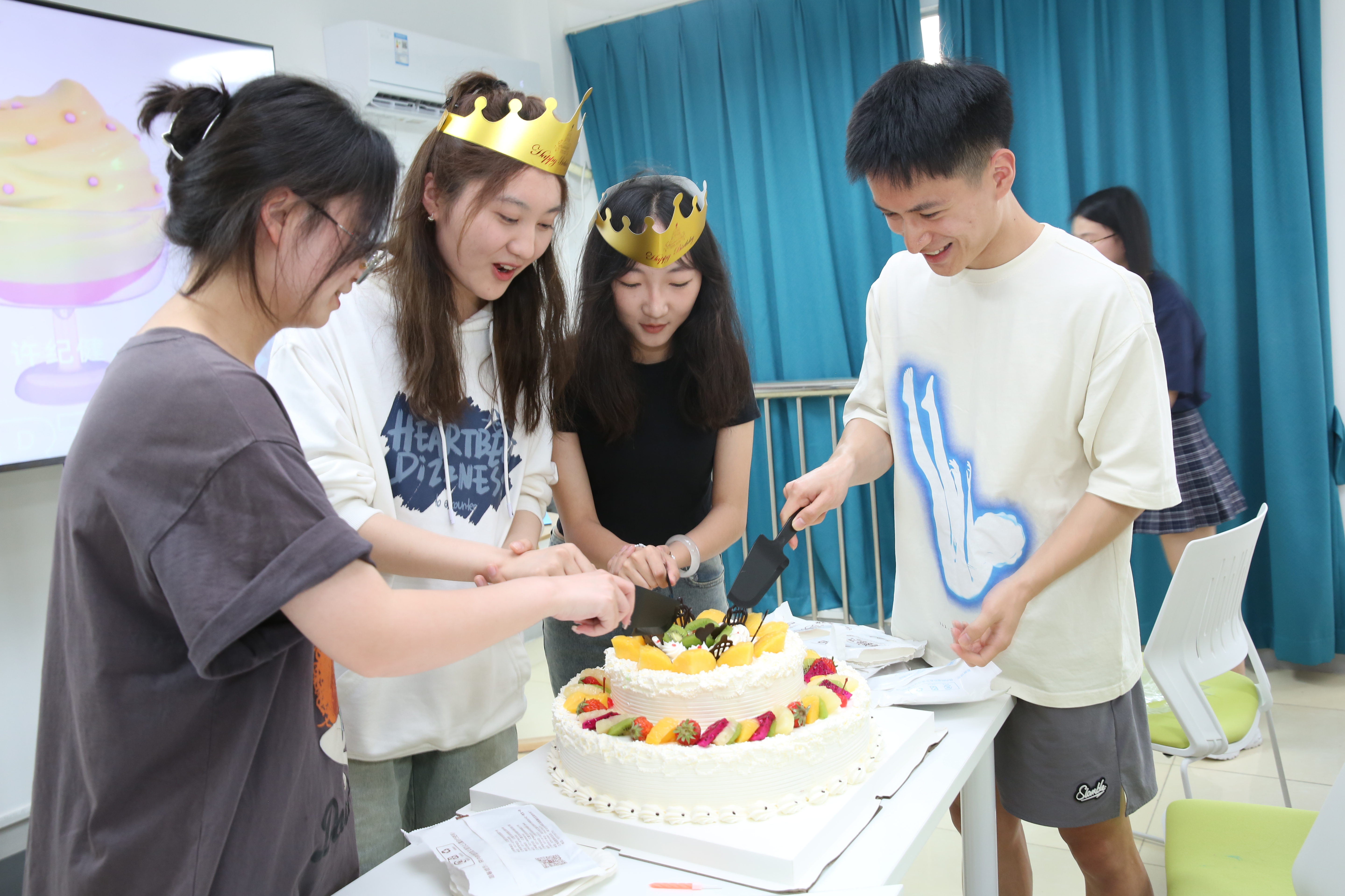 “祝你生日快乐,happy birthday to you!”大家为过生日的学生齐声唱起生日歌,同学们一起吹蜡烛、许愿和拍照。在热烈的掌声与祝贺中,“寿星”们为大家切分蛋糕,共同分享今天的快乐。