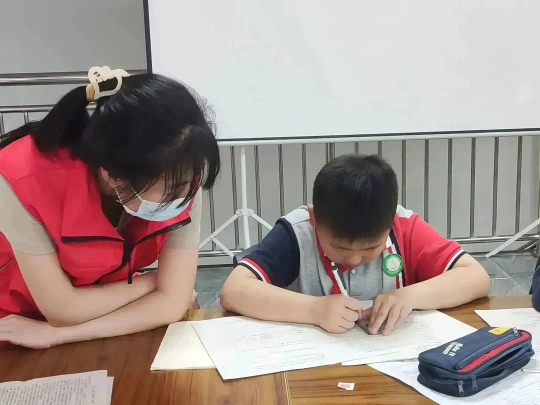 图为志愿者陪伴小朋友写作业