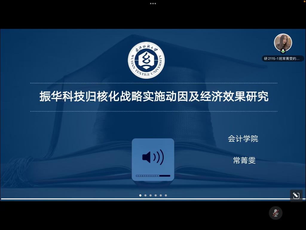常菁雯同学分享的论文题目是《振华科技归核化战略实施动因及经济效果研究》,常菁雯同学向我们介绍了该论文的研究背景与意义、国内外研究现状、研究方法及技术路线图,最后分析了论文中可能存在的创新点与不足之处。麻丽娜老师对该论文的理论意义、技术路线图以及文中提到的措施与效果提出了完善建议。