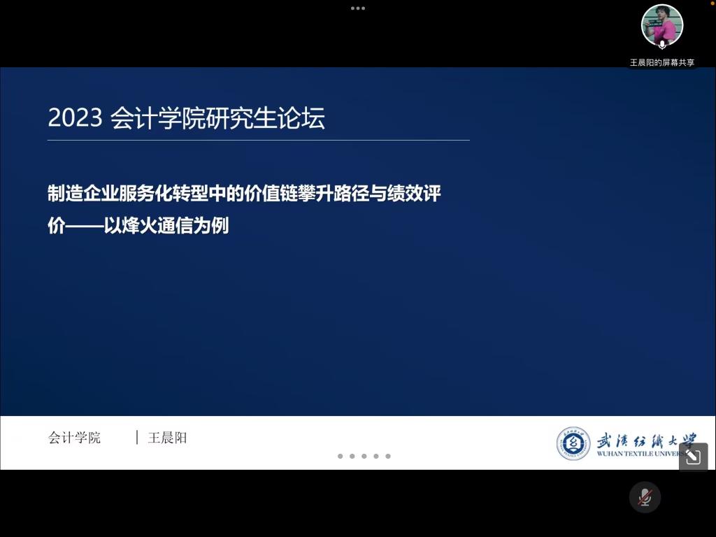 王晨阳同学分享的论文题目是《制造企业服务化转型中的价值链攀升路径与绩效评价——以烽火通信为例》,详细介绍了论文的研究背景、研究意义、国内外研究现状、可能的创新之处、研究方法与技术路线。麻丽娜老师点评到论文中企业服务化转型与价值链关系有割裂,并且提出需要对制造业服务化转型现状以及财务绩效维度选取的依据进行补充。