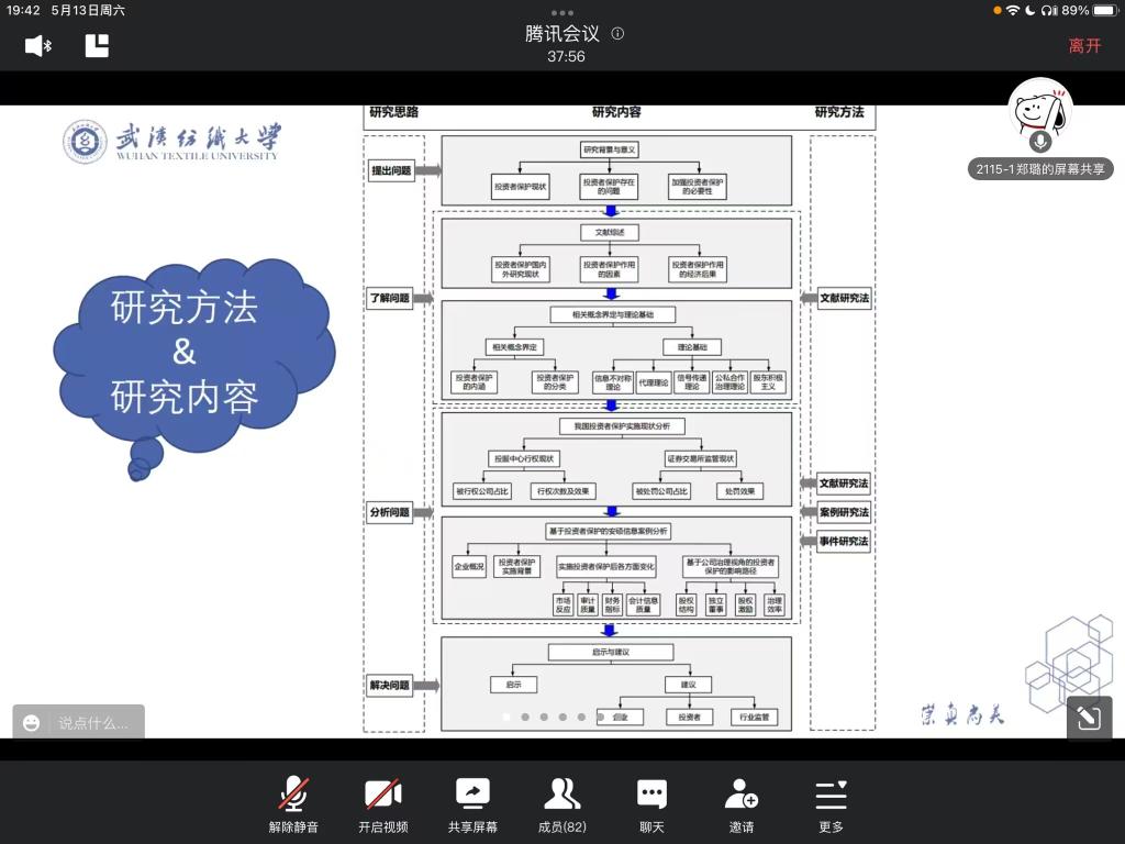 郑璐同学分享的论文题目是《基于公司治理视角的投资者保护效果研究——以安硕信息为例》, 通过对研究背景、研究目的、研究方法、研究重难点、研究创新点的详细讲解,让大家了解该选题的意义和可行性。麻丽娜老师对论文框架提出建设性建议。