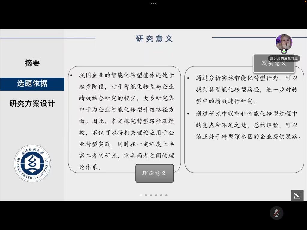 郭芸潇同学分享的论文题目是《企业智能化转型路径及其绩效研究——以中联重科为例》,从研究对象、研究问题、研究思路、选题依据、研究方案设计多方面对论文进行分析讲解。麻丽娜老师对该论文的逻辑架构提出完善建议,并提出可以结合实证研究来增强说服力。