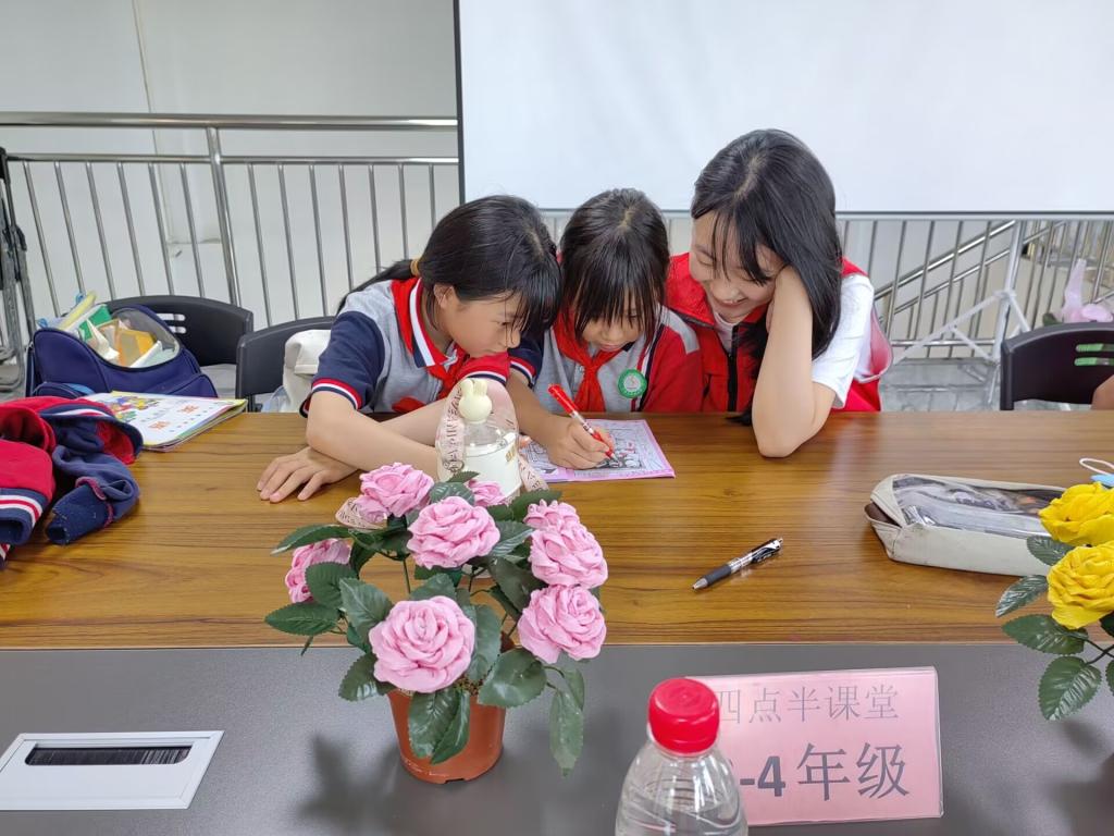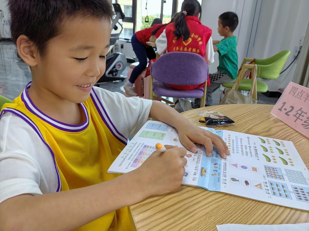 图为志愿者帮助小朋友解决难题