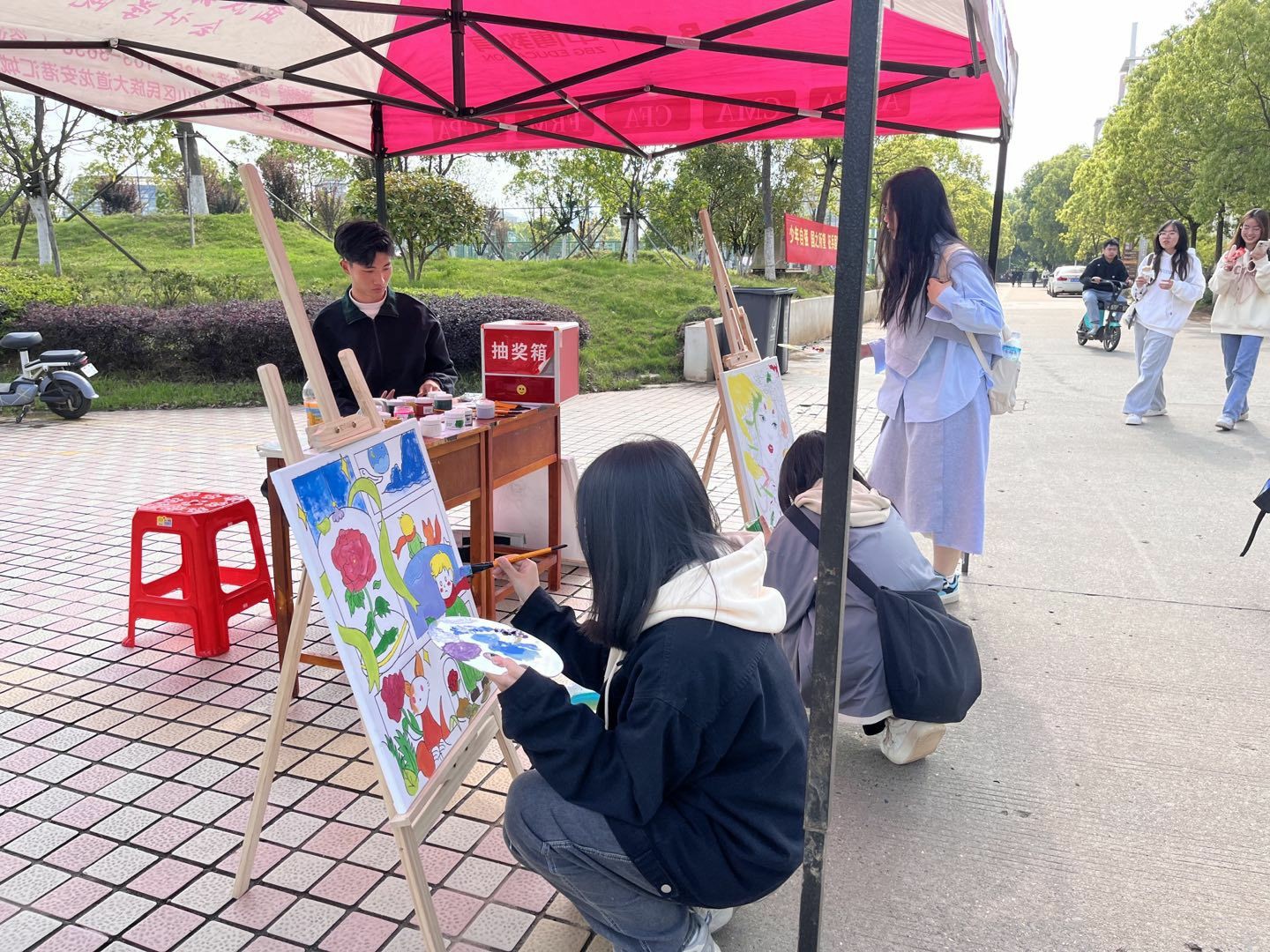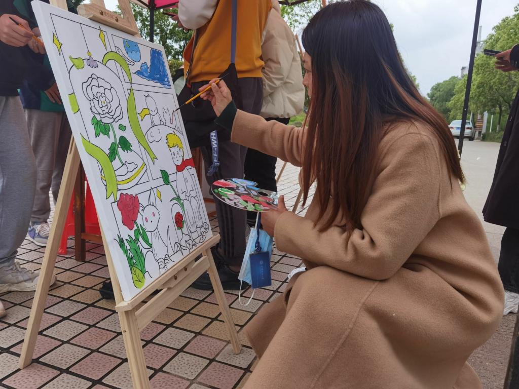 老师驻足,拿起画笔感叹久违的绘画时光;同学停步,沾上颜料感受难得的艺术创作。“我也可以来画一下吗?”刚刚结束课程的老师向工作人员询问道。她放下手提包,拿起画笔,开始描绘她心中的“小王子”。
