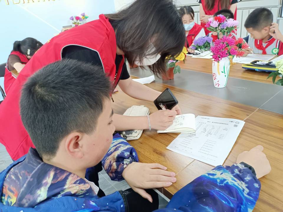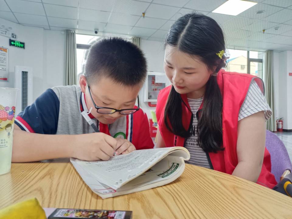 图为志愿者陪伴小朋友写作业