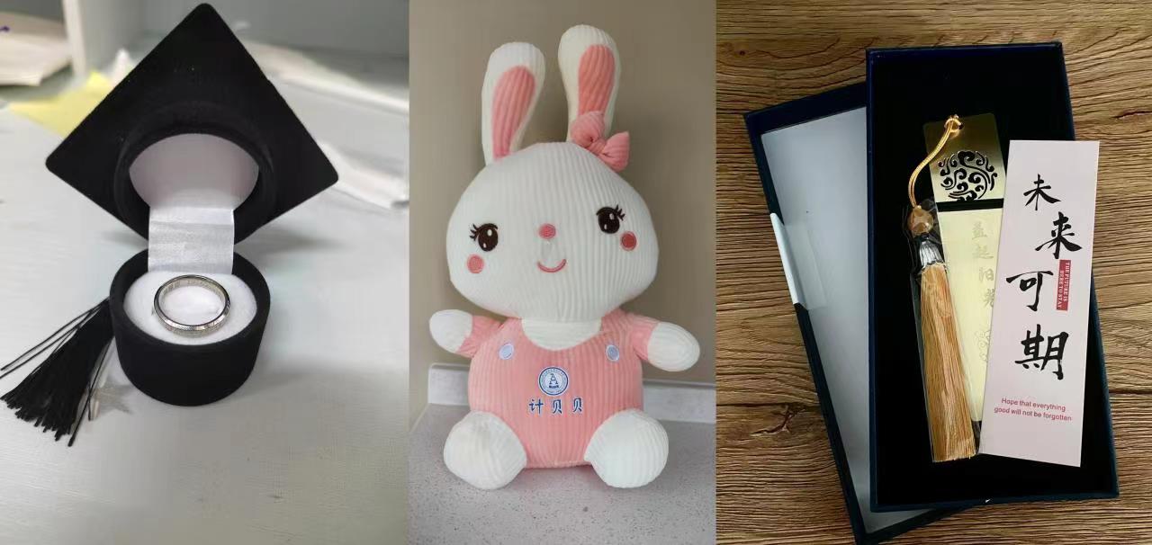 院领导班子、辅导员、班主任为全体毕业生送上“计贝贝”创意玩偶、刻有毕业生姓名和学号的专属戒指、毕业书签等纪念品。“学院送的纪念品摆了满满一桌子,拿到之后非常感动,学院和老师真的用心了”,财管11901班的易国露在收到纪念品后这样说。