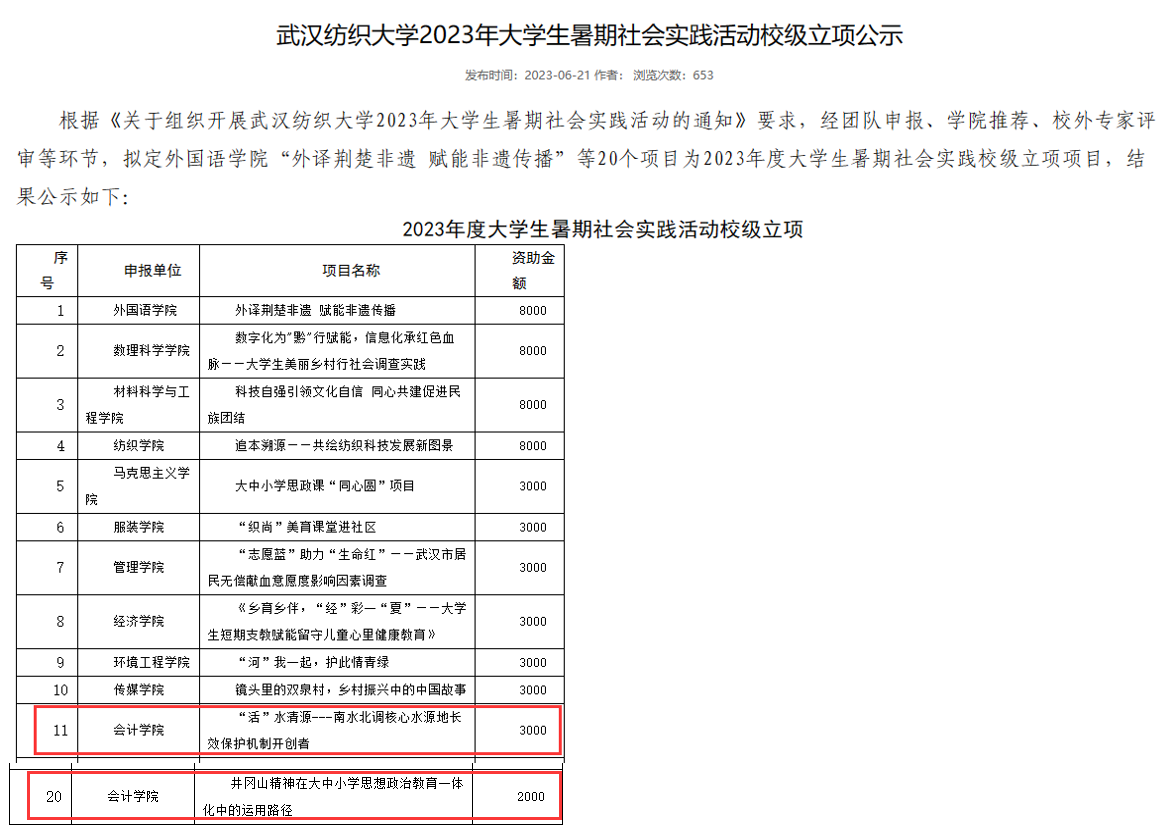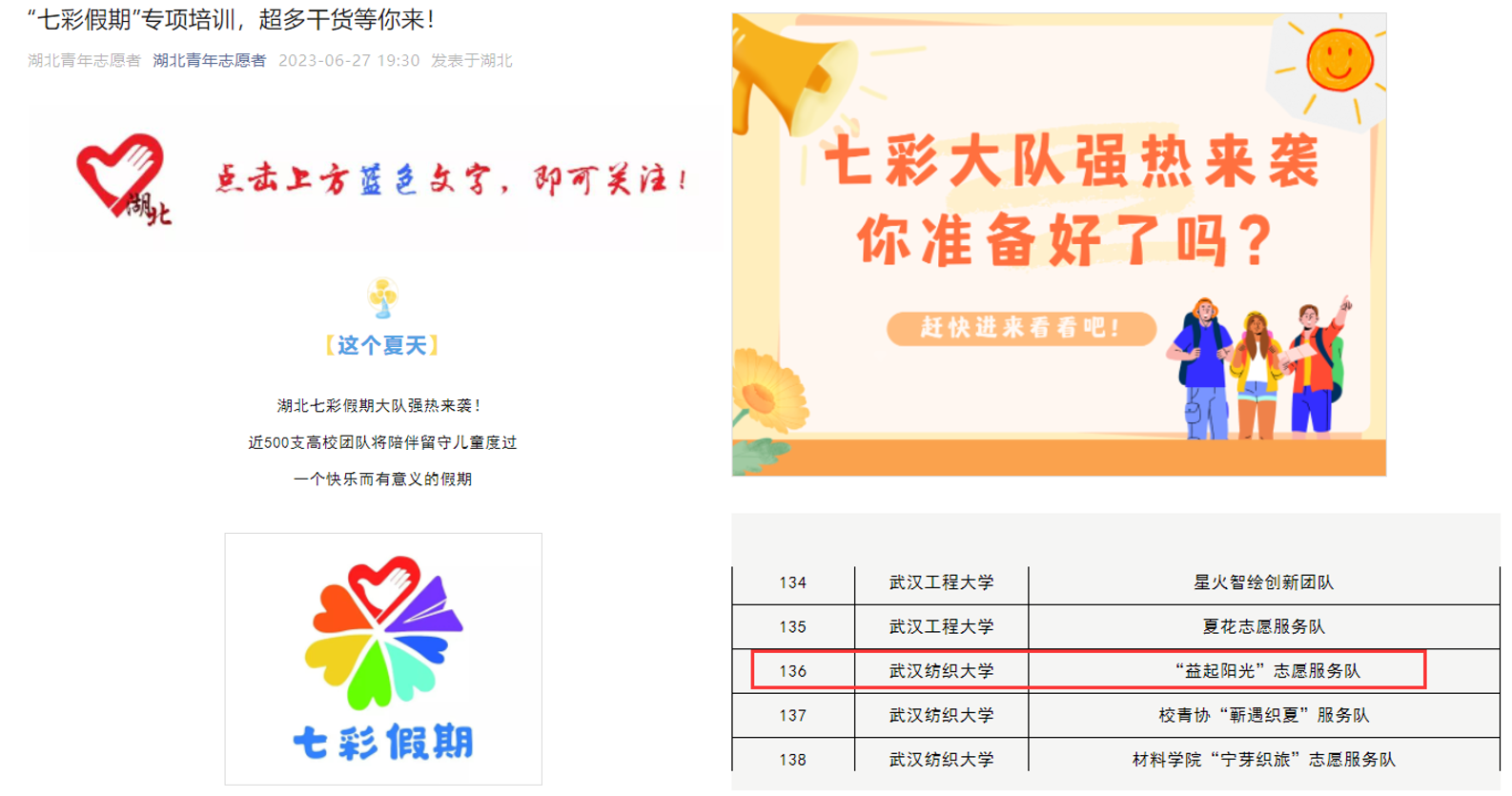 6月,共青团湖北省委员会、湖北省志愿者协会发布2023年湖北省“七彩假期”团队名单,yl23455永利官网“益起阳光”志愿服务队入选。同月,武汉纺织大学团委发布《武汉纺织大学2023年大学生暑期社会实践活动校级立项公示》,yl23455永利官网《“活”水清源----南水北调核心水源地长效保护机制开创者》实践团队和《井冈山精神在大中小学思想政治教育一体化中的运用途径》实践团队获批校级立项,获5000元实践经费。