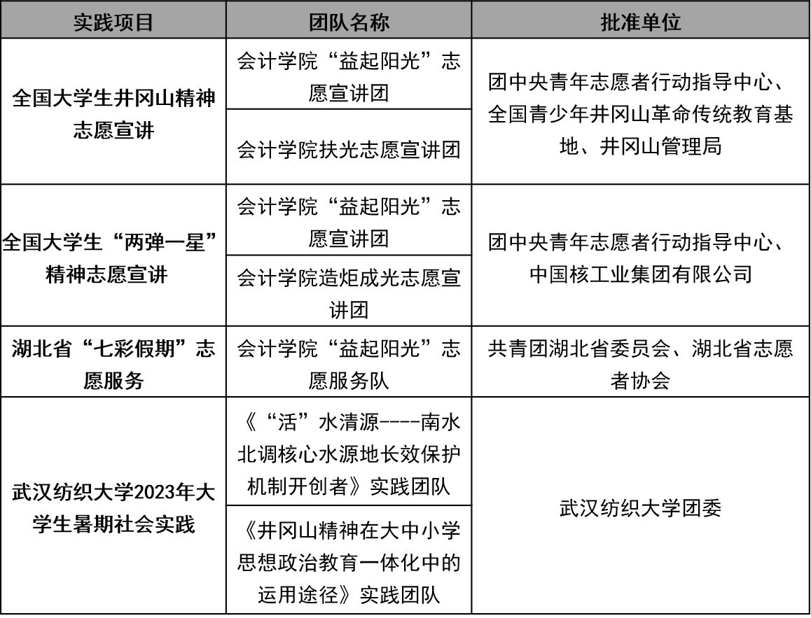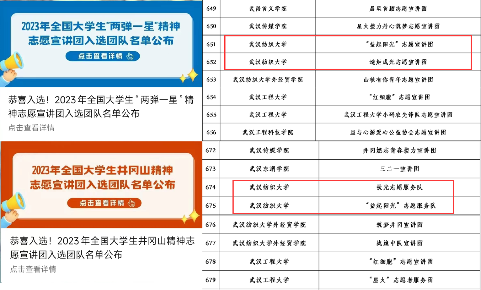 近日,团中央、团省委、校团委陆续发布各类社会实践立项名单,yl23455永利官网4个志愿服务队入选团中央井冈山精神和“两弹一星”精神志愿宣讲团,“益起阳光”志愿服务队获批湖北省“七彩假期”团队,《“活”水清源----南水北调核心水源地长效保护机制开创者》和《井冈山精神在大中小学思想政治教育一体化中的运用途径》项目获批武汉纺织大学2023年大学生暑期社会实践活动校级立项。