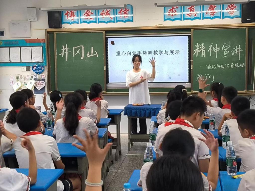 志愿者李欣颖自编手指舞,生动地向小朋友们讲解何为井冈山精神。志愿者朱增豪宣讲“两弹一星”精神,小朋友们在学习中更加坚定了传承优良作风、赓续红色血脉的信念。“‘热爱祖国、无私奉献、自力更生、艰苦奋斗、大力协同、勇于登攀’的‘两弹一星’精神,带领全国各族人民为实现中华民族伟大复兴的中国梦而不懈努力。”朱增豪在讲解时这样说。