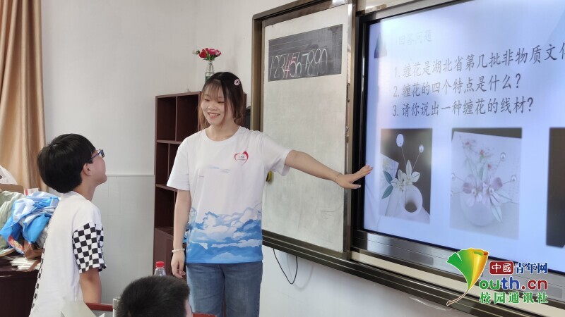 图为实践队员带领小朋友们学习缠花,身临其境领略非遗之美,增强文化自信。中国青年网通讯员 柳丽婷 摄