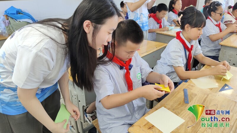 图为实践队员指导小朋友折纸,一折一叠间,一张普普通通的纸就变得立体起来。中国青年网通讯员 柳丽婷 摄