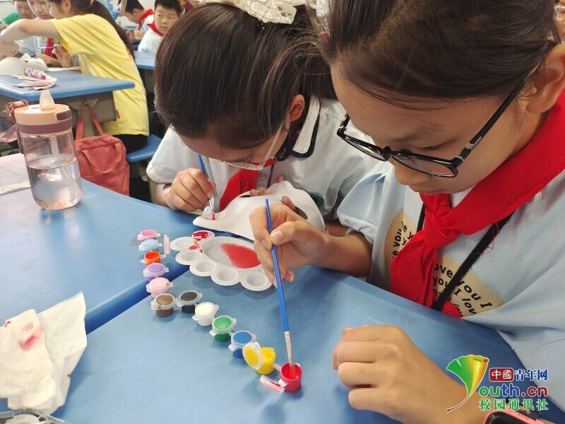 图为小朋友们手持画刷,在空白脸谱上认真地勾勒出角色特征,焕发非遗时代风采。中国青年网通讯员 卢慧敏 摄