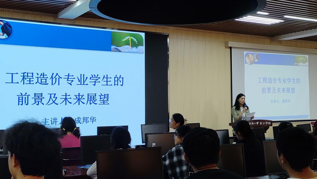 本次讲座邀请到硕士研究生导师、正高级工程师全国一级注册造价工程全国注册咨询工程师全国监理工程师国家司法鉴定人武汉市事业单位面试考官、武汉市高(中)级评审委员会专家库委员、湖北省建设工程招标评标专家评委成邦华,讲座主题为“工程造价专业学生的前景及未来展望”。成老师介绍了工程造价专业的前景及人才培养的目标和要求,解释了工程造价的内涵及其管理,为工程造价专业学生揭示了工程造价的重要性以及专业的未来展望,让新生们对专业有了深入的了解。