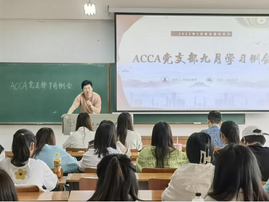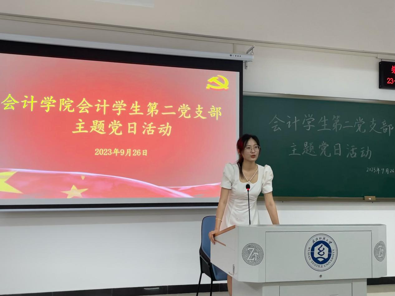 会计学专业学生第二党支部书记陈宇凡领学了校长徐卫林院士在2023年开学典礼上的二十个关键词,鼓励同学们努力学习、争当榜样,以无问西东的精神执著追求目标,同时,陈宇凡以开学典礼中的在校生发言代表、CMA12101班张婧轩同学为例,号召同学们严格要求自己,向身边的优秀党员同学看齐。