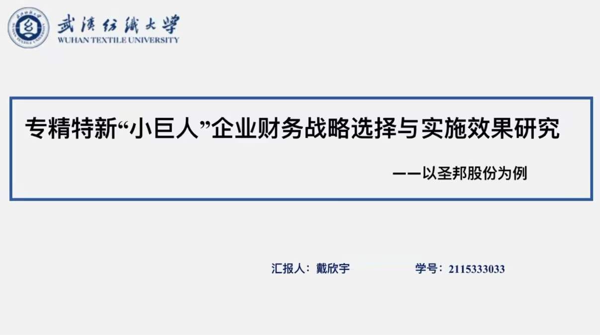 戴欣宇同学分享的论文主题是《专精特新“小巨人”企业财务战略选择与实施效果分析——以圣邦股份为例》,戴欣宇同学向我们介绍了该论文的选题背景、文献综述、研究意义、研究方法、技术路线和可能的贡献点,选题新颖。吴莎老师指出论文的研究方法和贡献点一般在三个左右,可以做适当补充。