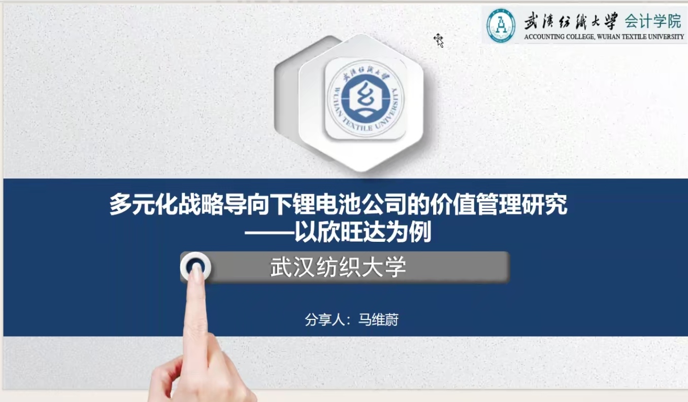 会上,马维蔚同学分享了她的论文《多元化战略导向下锂电池公司的价值管理研究—以欣旺达为例》,马维蔚同学从研究背景、研究意义、研究方法、研究内容和创新之处等多方面进行了分析讲解。万军老师提出的建议是在文章开头阐述多元化战略的概念、内涵及驱动因素,综合实际案例分析内外部因素。