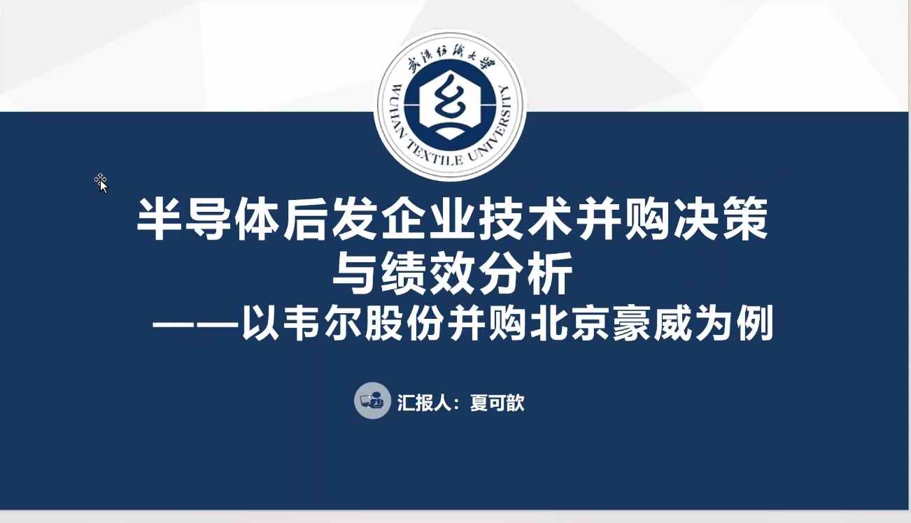 夏可歆同学分享的论文主题是《半导体后发企业技术并购决策与绩效研究—以韦尔股份并购北京豪威为例》,夏可歆同学从研究意义、研究内容、国内外研究现状、研究方法、研究内容与研究框架、创新点几个部分分别展开描述。万军老师建议在文章中加入普华永道的审计报告,并在文章开头阐述后发企业的定义以及相关概念。