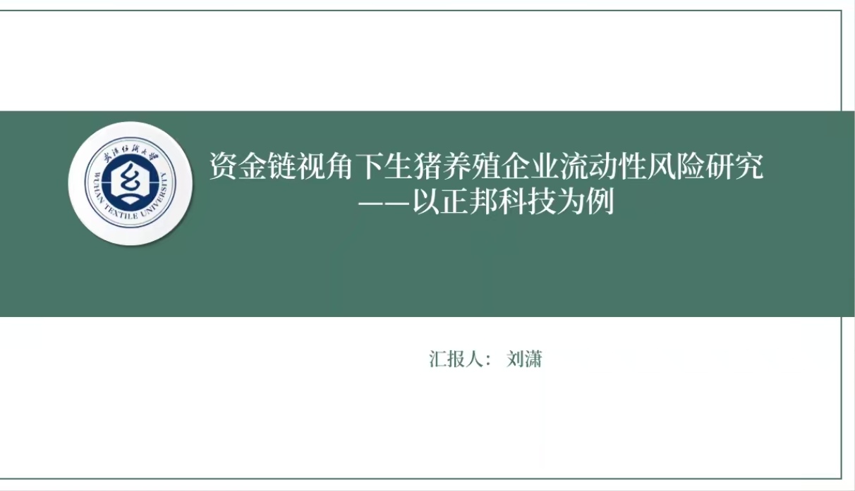 刘潇分享的论文研究主题是《资金链视角下生猪养殖企业流动性风险研究—以正邦科技为例》,具体介绍了论文的研究背景与意义、国内外研究现状、研究目的与内容、研究方法与技术路线图及文章的创新点。万军老师提出的建议是在文章开头添加资金链视角的相关概念,加强理论与主题的联系。