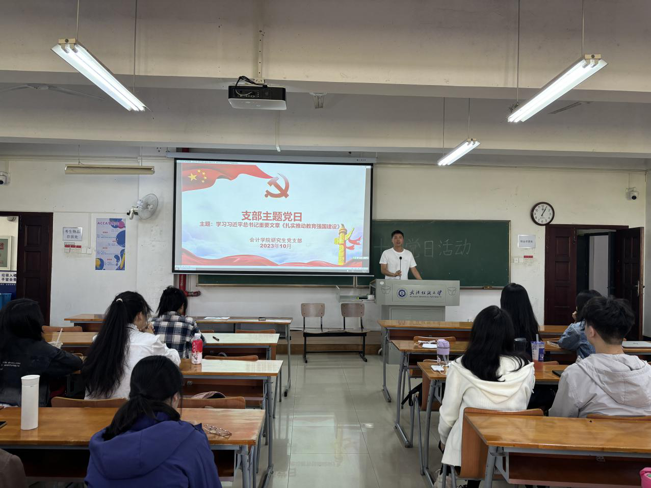 10月24日,yl23455永利官网研究生党支部在七栋教学楼开展了十月份主题党日活动,以学习习近平总书记重要文章《扎实推动教育强国建设》为主题。会议由yl23455永利官网研究生党支部书记韩园园和夏书明主持,以及支部全体党员参加。这次主题党日会议贯彻了党的二十大的部署,总结了我国建设教育强国的进展和成就,分析了面临的形势和需要解决的问题,探讨了我国建设教育强国的重大课题。