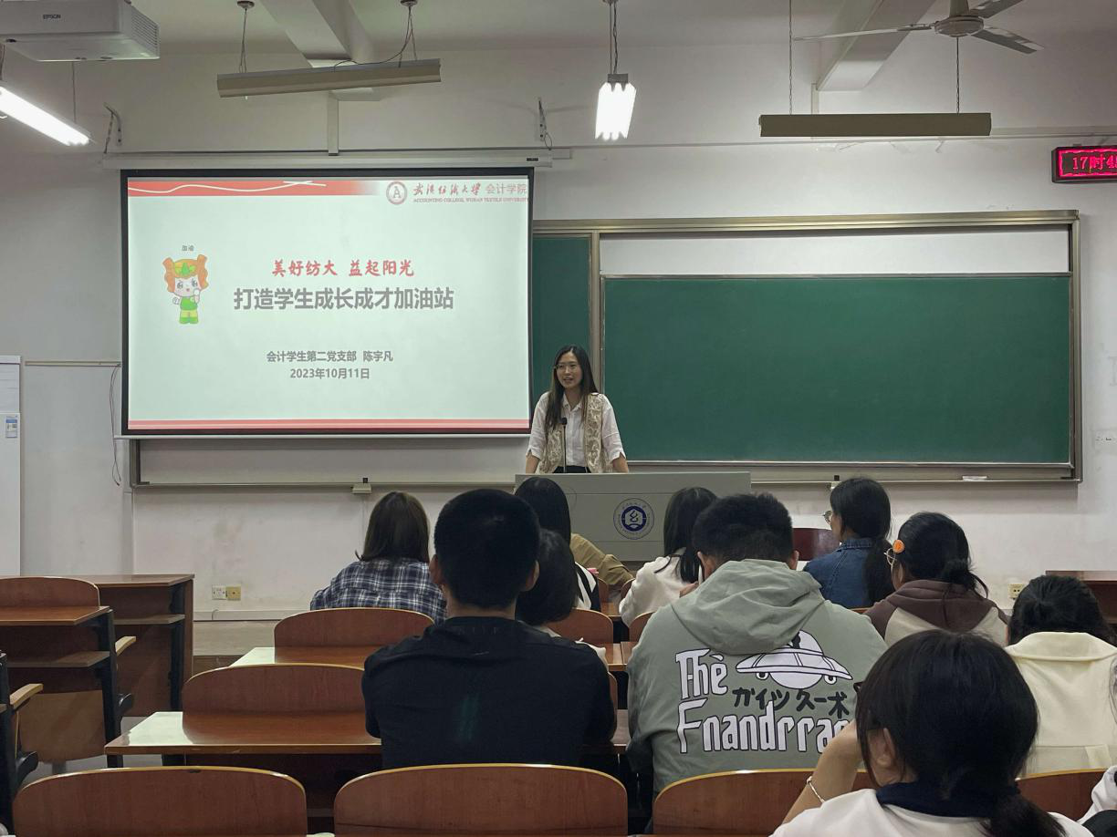 10月11日晚上,会计学专业学生第二党支部在崇志楼109教室召开支部学习例会,会议由支部书记陈宇凡主持。陈宇凡向与会成员介绍了学院“一站式”学生社区服务驿站——“益起阳光”加油站的建设情况,着重讲解了学生党员在其中发挥的积极作用。