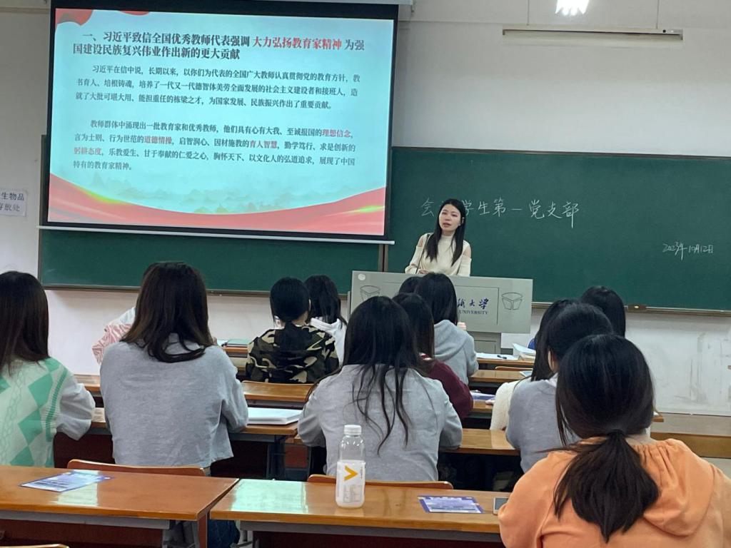 10月12日,会计学专业学生第一党支部在崇德楼107教室开展支部政治理论学习,学习会上,支部书记王霄鹤带领支部党员学习了习近平总书记在全国教师节大会上的致信,并认真学习了习近平总书记重要文章《扎实推动教育强国建设》,提醒在场支部党员要牢记党员初心使命,扎实学好专业知识。