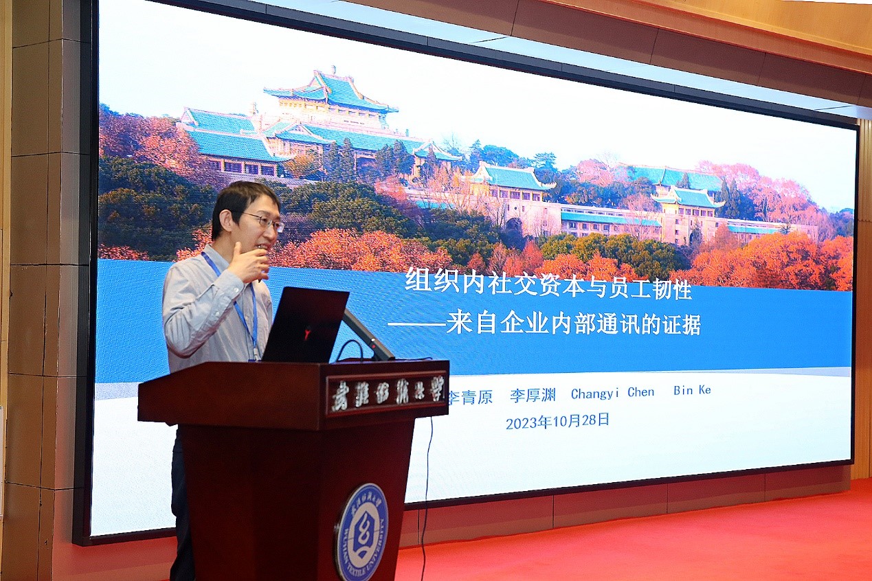 武汉大学李青原教授作题为《组织内社交资本与员工韧性——来自组织内部通讯的证据》的主题报告,南京理工大学徐光华教授主持报告会。李青原教授通过对企业内部员工的信息进行建构模型分析,得到分析情感表达以及相互支持对于社会资本的作用,突出强调“理工科与经济学相结合的应用场景将会更加广泛”这一观点。