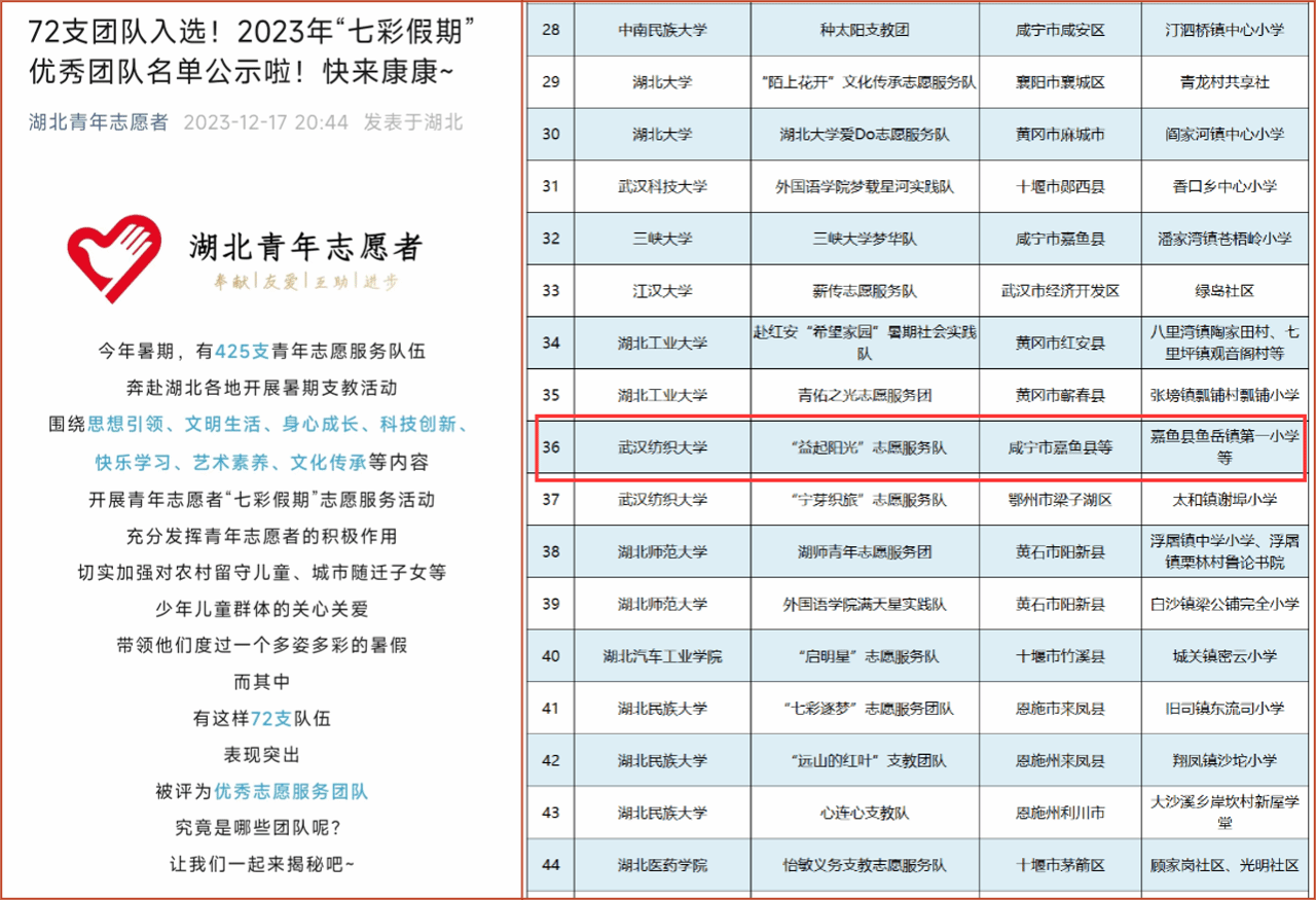 “益起阳光”志愿服务队入选2023年湖北省“七彩假期”优秀团队