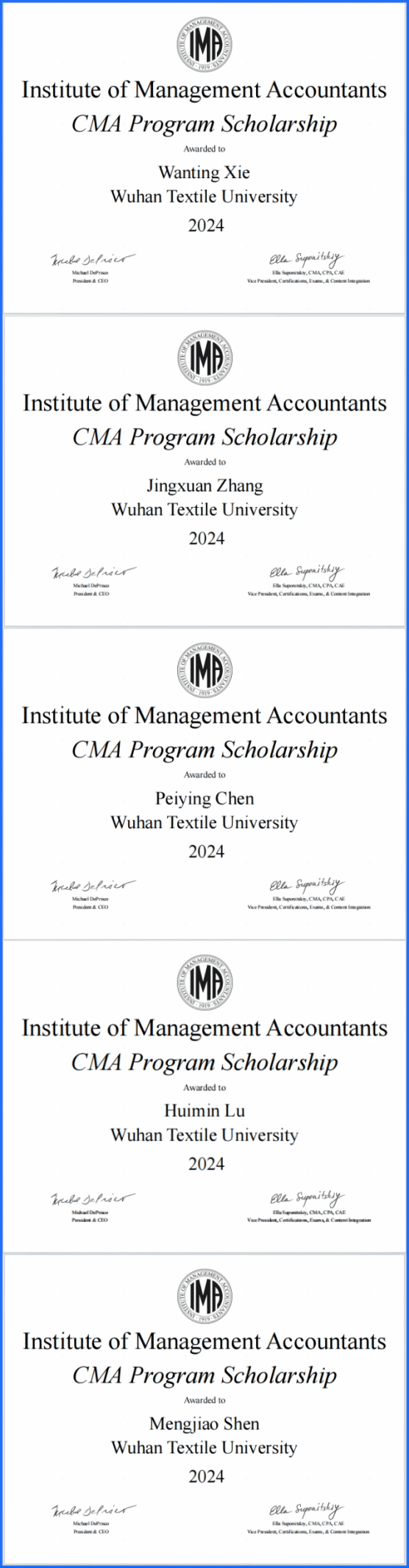 20241月,我院2020级财务管理专业(CMA方向班)谢婉婷和2021级财务管理专业(CMA方向班)陈沛滢、卢慧敏、沈梦娇、张婧轩5位同学荣获IMA协会CMA奖学金,CMA奖学金等值金额约6000元人民币,这些荣誉既是对学子们学习成绩的肯定,更是对低年级同学们的鞭策与鼓励。