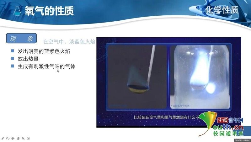 “空气中占比百分之二十一的气体是什么呢?”志愿者王如忻以提问引入氧气的物理性质,又通过实验视频和图片为大家介绍了氧气的化学性质以及收集氧气的方法。志愿者王思梦对氧气的制备原理进行了详细讲解,并和同学们一起探讨不当仪器的选择对实验带来的影响。在课堂结束时,王思梦对同学们寄语:“生活中有很多化学小知识,希望大家能够积极发现生活中的化学,享受化学学习中的无限乐趣。”
