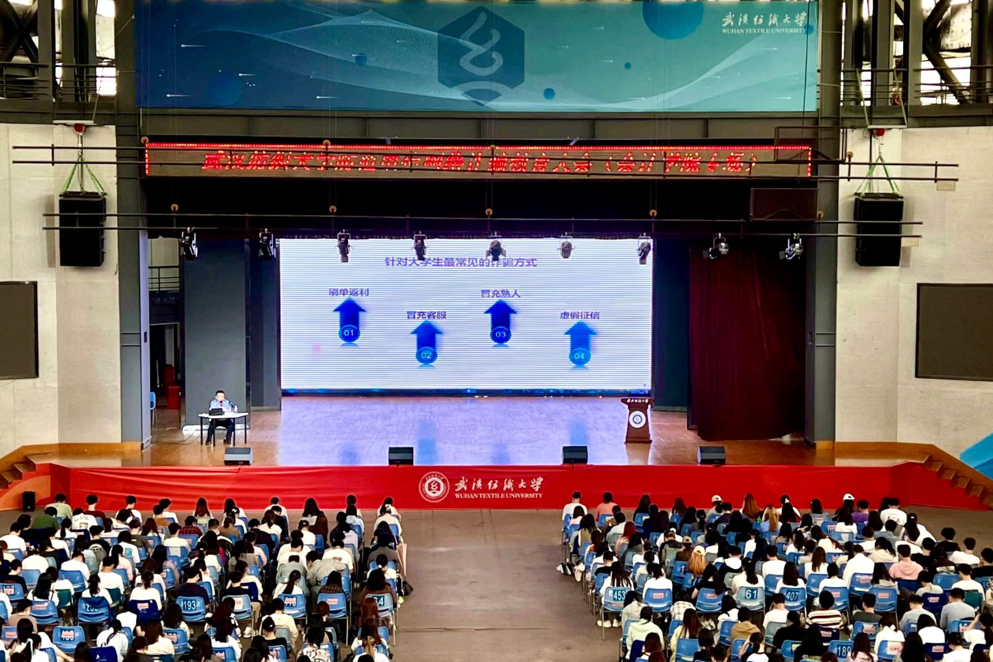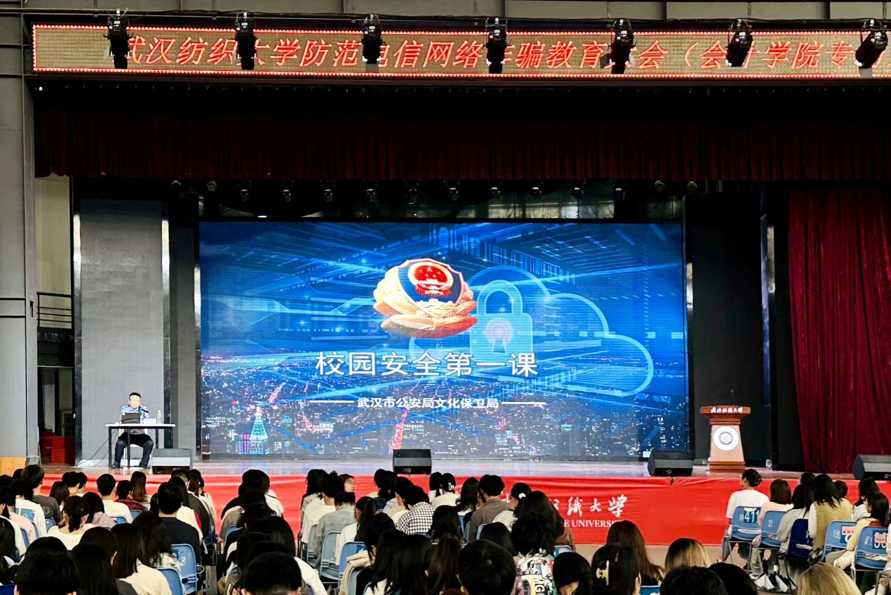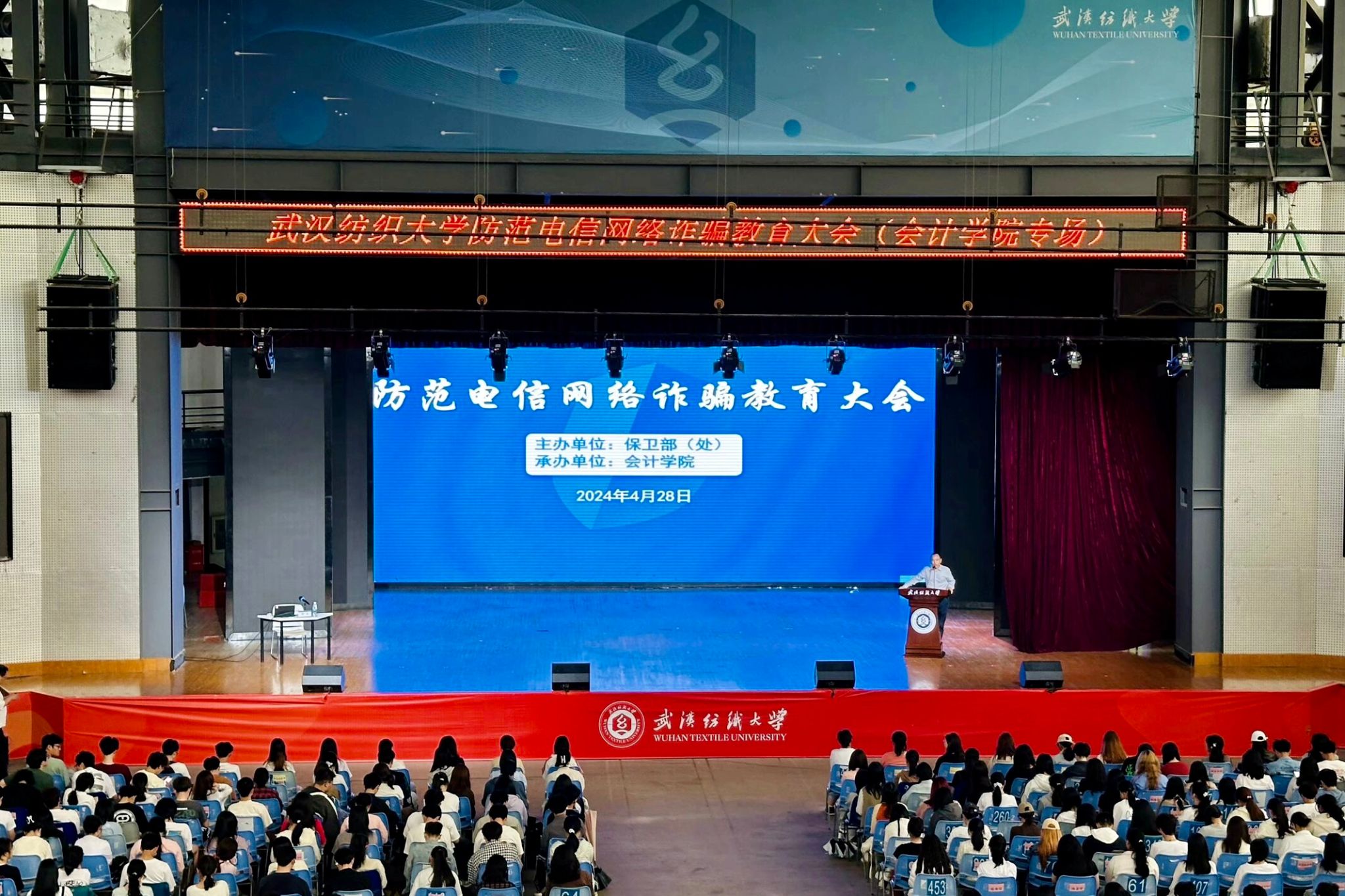 为增强学生的安全意识,有效提高应对网络诈骗的能力,持续推进防范电信网络诈骗工作常态化开展,4月28日下午,防范电信网络诈骗教育大会(yl23455永利官网专场)在阳光校区大学生活动中心演播厅举行。本次大会特邀武汉市公安局文化保卫局陶涛警官担任主讲人,为yl23455永利官网全体本科生、研究生开展专题教育培训。保卫处、yl23455永利官网相关负责人出席大会,保卫处处长蒋卫城主持大会。