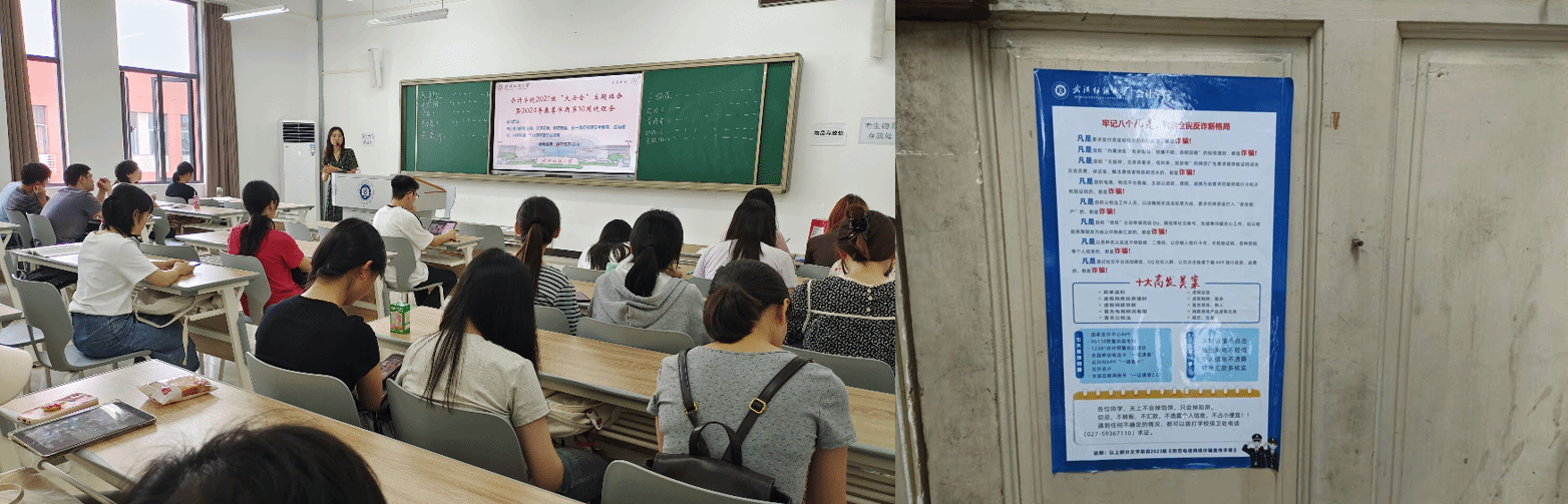针对近期电信网络诈骗高发趋势,yl23455永利官网结合“五一”假期安全教育,组织各班级召开了安全教育专题班会,组织学习了防范电信网络诈骗相关知识,并在全体学生宿舍张贴了反电诈宣传教育海报,提高学生警惕意识。