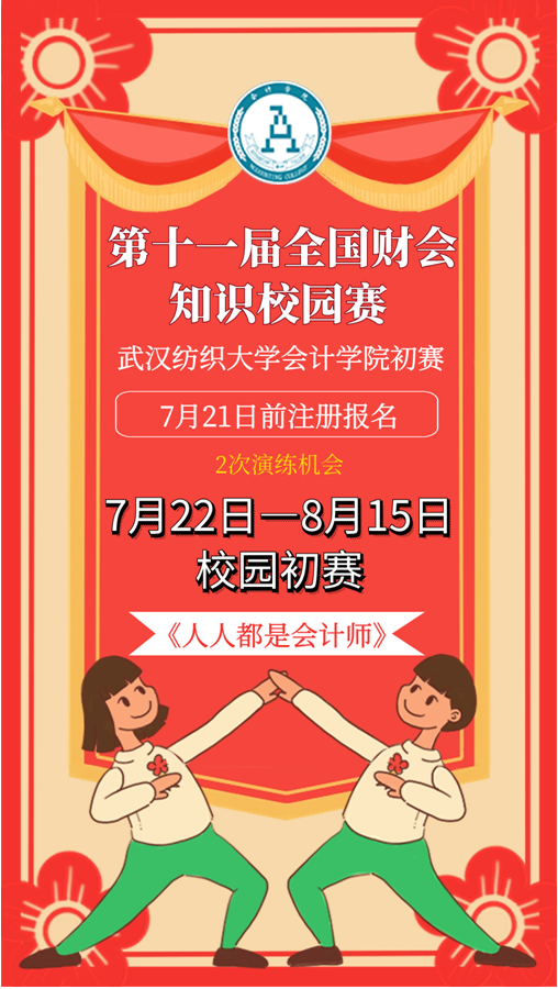 第十一届全国财会知识校园赛已经启动,为丰富我院同学们的暑期生活,提高大学生们开展实践和学科竞赛积极性,学院要求2018、2019级会计学和财务管理学专业的同学即日起至8月15日前按赛事完成100%注册竞赛报名,其他年级同学也希望积极报名参加,请同学们按照发放的流程(见附件),积极备赛。在8月15日前进行校园赛的演练(每位同学有2次演练机会),熟悉大赛流程和比赛内容。提示,原始账号:hb+手机号,密码:123456,账号密码无法登录的话,可以使用手机号加验证码的方式登录。