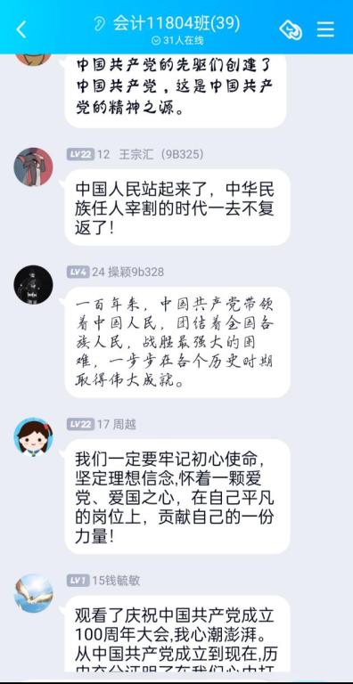 活动最后,同学们积极在团支部群里展开讨论,畅谈体会感受。会计11804班的周越同学说:“我们一定要牢记初心使命,坚定理想信念,怀着一颗爱党、爱国之心,在自己平凡的岗位上贡献力量!”
