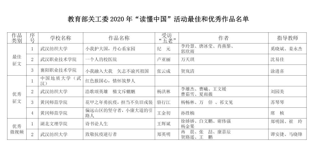 近日,教育部关工委公布了2020年“读懂中国”活动评审结果,我校关工委选送的yl23455永利官网组织创作的征文《小我护大国,丹心系家园》被评教育部关工委2020 年“读懂中国”活动最佳征文,并入选中国教育电视台“读懂中国”活动优秀作品专题展播。环境学院组织创作的征文《浩歌颂英雄檄文斥魍》被评为优秀征文,传媒学院组织创作的微视频《致敬抗疫逆行者》被评为优秀微视频。我校关工委获得优秀组织奖。