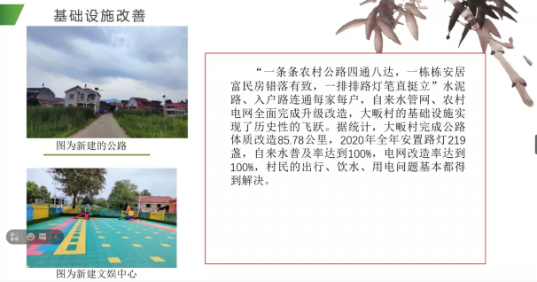 胡蝶展示了大冶市灵乡镇大畈村的发展变迁,她和团队成员以入户调查及走访村委会的方式,分别从住房、医疗、教育、基础设施建设等四个方面切入展开调研,充分展示了近年来脱贫攻坚工作给村民生活带来的变化。