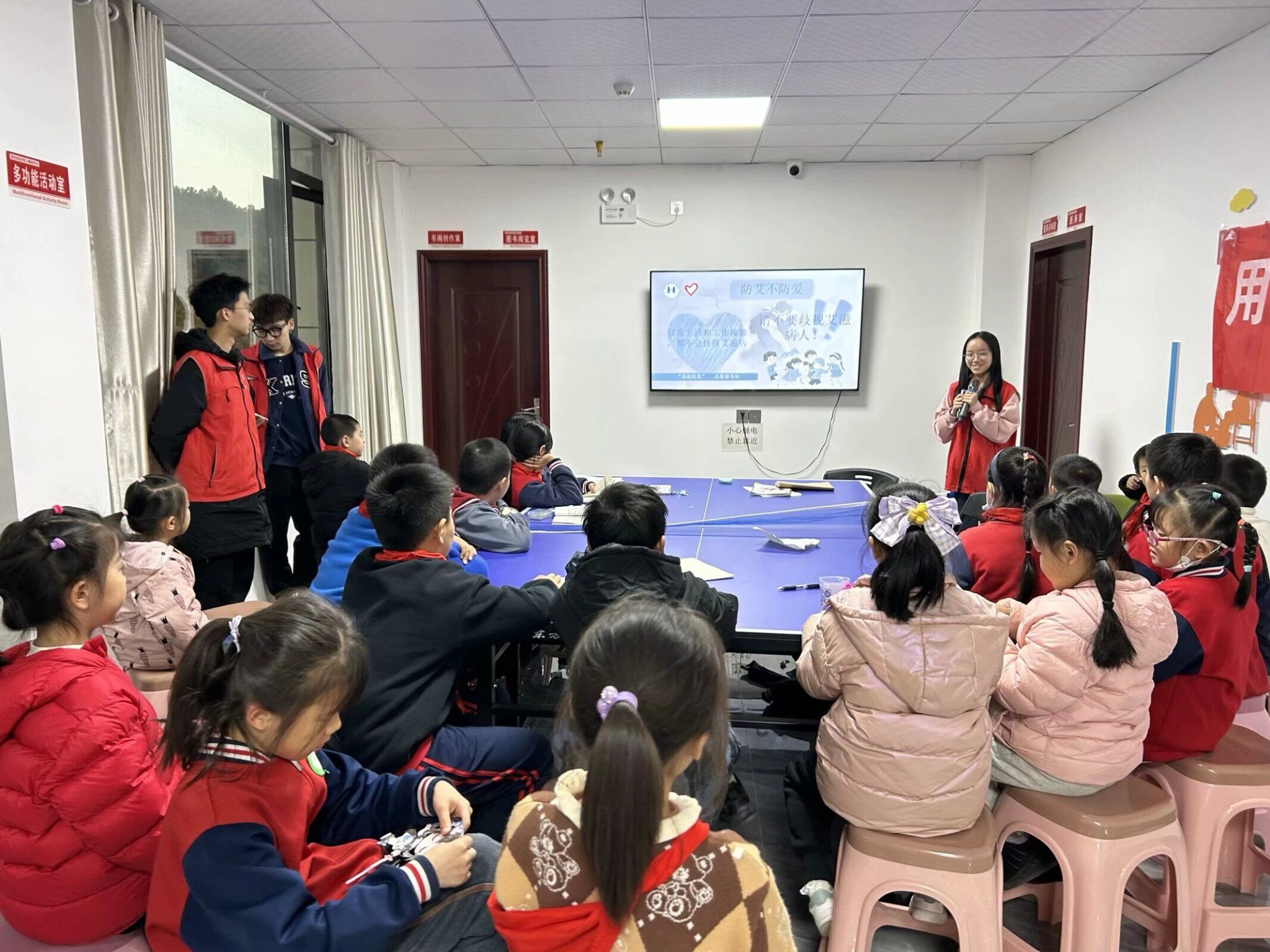 图三为志愿者为小朋友们讲解防艾知识