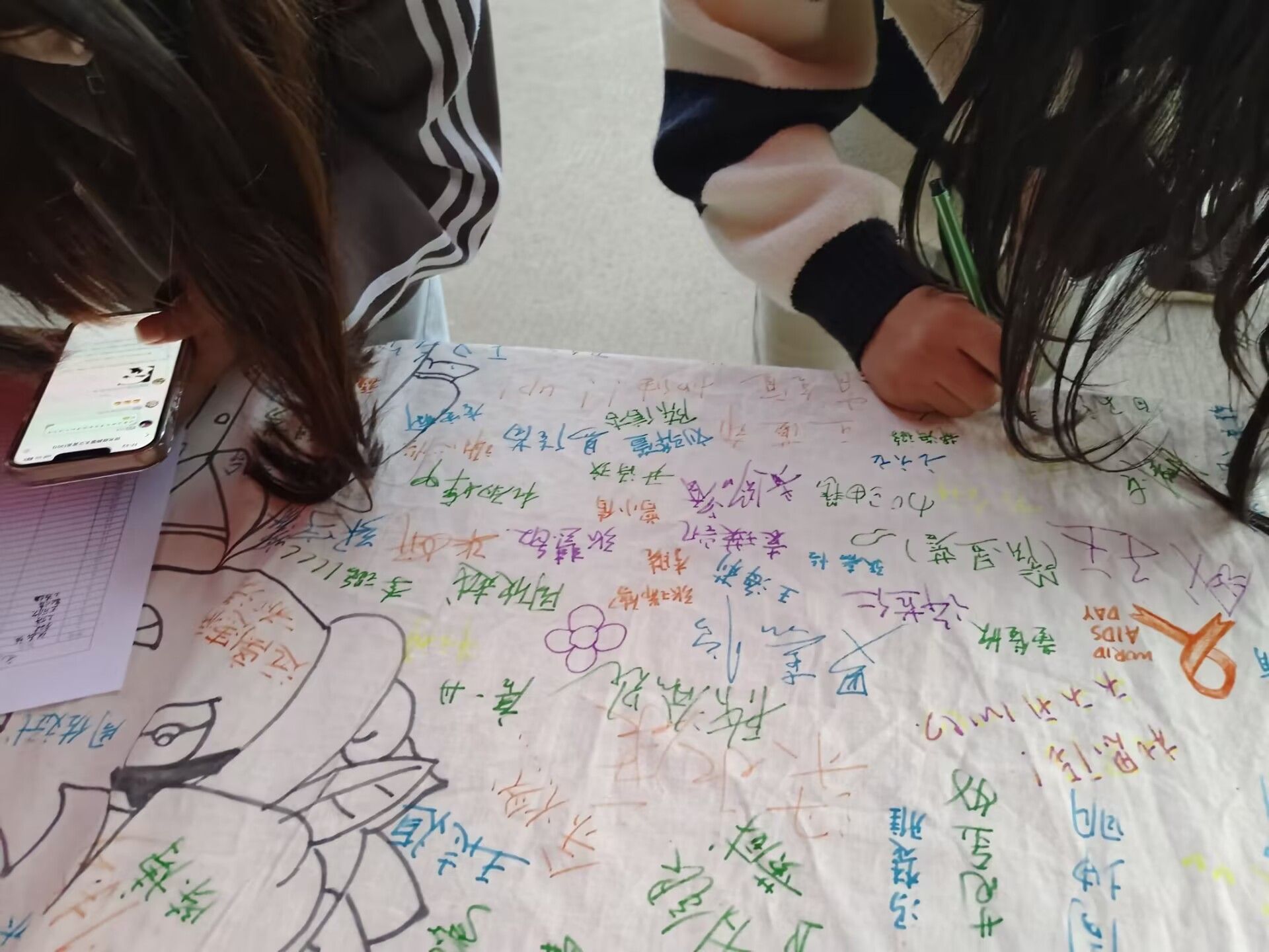 为了增强活动的趣味性和参与感,在纺织学院青年志愿者协会的大力支持下,服务队同步开展了“无‘艾’宣言”活动。同学们在布料上签名、留言,表达着对彼此的美好祝愿。活动反响热烈,摆点现场人头攒动,不少同学踊跃参与其中。会计12102班的陈圆同学在活动后感叹道:“参加此次活动后,我更加懂得身体健康的重要性,我会以实际行动宣传‘防艾’知识,带动更多同学热爱生活、珍惜生命。”