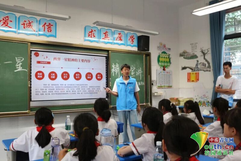 青春不负少年时,吾辈当以学为先。在课程开始前看到我们就问“你们是新老师吗?我们今天学习什么内容呀?”这些问候让我们对今天的课程期待值拉满。我负责的课程是“科学小实验”和“两弹一星”宣讲,在开始之前我非常忐忑,我本来以为小朋友会很害羞,会不好意思与我互动,没有想到的是小朋友们格外积极。在“生气的瓶子”环节,有三位小朋友与我一起参与了实验,更有小朋友在实验环节就猜到了实验原理,做完实验后很多小朋友表示回家要自己动手尝试。“原子弹、氢弹、导弹和人造地球卫星”在我询问“两弹一星”是什么的时候,一位小朋友迫不及待地告诉了我答案,当时我便被小朋友们的知识贮备所惊讶,由此可见随着社会的不断发展进步,小朋友们对于知识的接收越来越便捷,知识储备量也越来越丰富。“热爱祖国、无私奉献、自力更生、艰苦奋斗、大力协同、勇于攀登”最后,我和小朋友们一起重温了“两弹一星”精神,我相信在一代又一代人的接续奋斗中,我们国家将会发展地越来越繁荣!